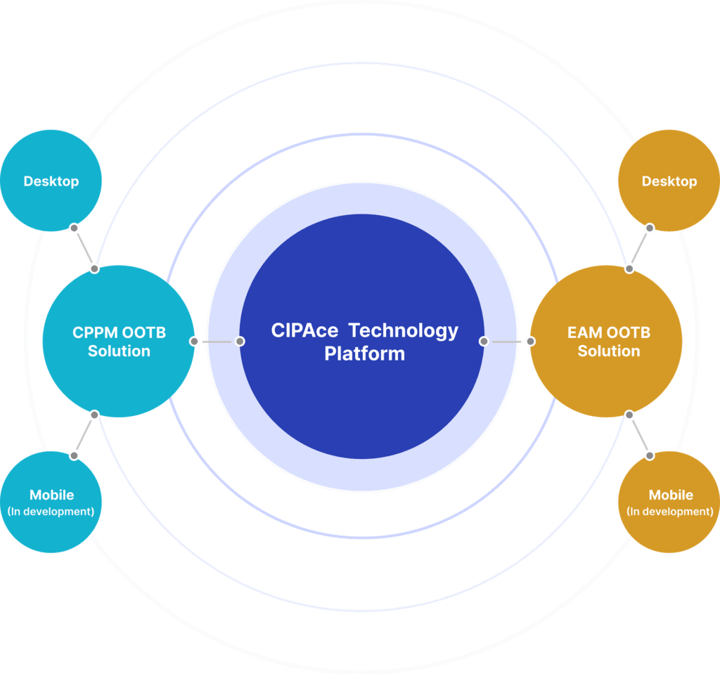 The CIPAce™ Technology Platform serves as a robust foundation for building various out-of-the-box (OOTB) solutions designed for ease of use, scalability, and rapid deployment. Both the Capital Program and Project Management (CPPM) and Enterprise Asset Management (EAM) leverage the platform’s capabilities to provide tailored and efficient tools for specific business needs.
